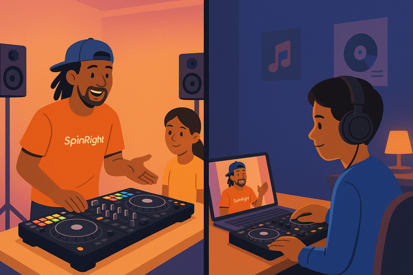 At SpinRight Academy, our approach is simple: make learning music both fun and foundational. We know every student’s rhythm is different, so our programs combine the human energy of in-person instruction with the convenience of modern technology. Students get access to real DJ equipment, creative challenges, and one-on-one mentorship — along with digital tools that help them